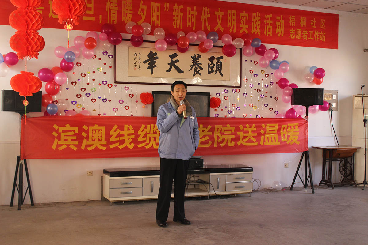 2018年12月29日,濱北辦事處人大委員會(huì)主任王孟峰、副主任王霞以及山東濱澳電線電纜有限公司總經(jīng)理、濱城區(qū)工商聯(lián)副會(huì)長(zhǎng)董桂光等一行人來(lái)到濱北中心敬老院看望慰問(wèn)生活在那里的老人和工作人員,濱澳線纜并為他們送上蔬菜、米、面等慰問(wèn)品。同時(shí)為每位老人準(zhǔn)備了一份節(jié)日禮物。